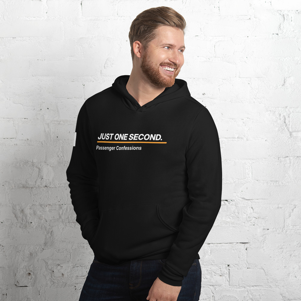 Deadpan rideshare humor from Passenger Confessions. Clean, bold, and instantly familiar, this hoodie turns one of the most common passenger delay lines into a simple statement piece. Soft, warm, and built for drivers, passengers, and anybody who knows every ride comes with a story.